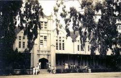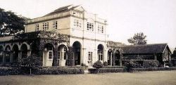 Simms was the central building on the campus. Quite beautiful with a wide balcony, and beyond the driveway which passed along its front there was a large shaded area under a row of huge ancient ficus trees. These are now gone but the building, which no longer houses dormitories, looks unchanged. There is a central tower, the base of which provides an overarching access to the building. Above that was a room for an assistant housemaster, and the room yet above extended beyond the ridge-line of the rest of the building. This could not be reached internally. A side door opened to the roof and a rickety wooden stairway, and once up that we could boost each other on to the very top. This was decorated with two stone griffons looking out across the playing field. Tradition required that the last school day of the year dawned to find them clothed, one in the school tie and a jockstrap and the other a brassiere. In my last two years I managed to find a place in the small party that outfitted them.